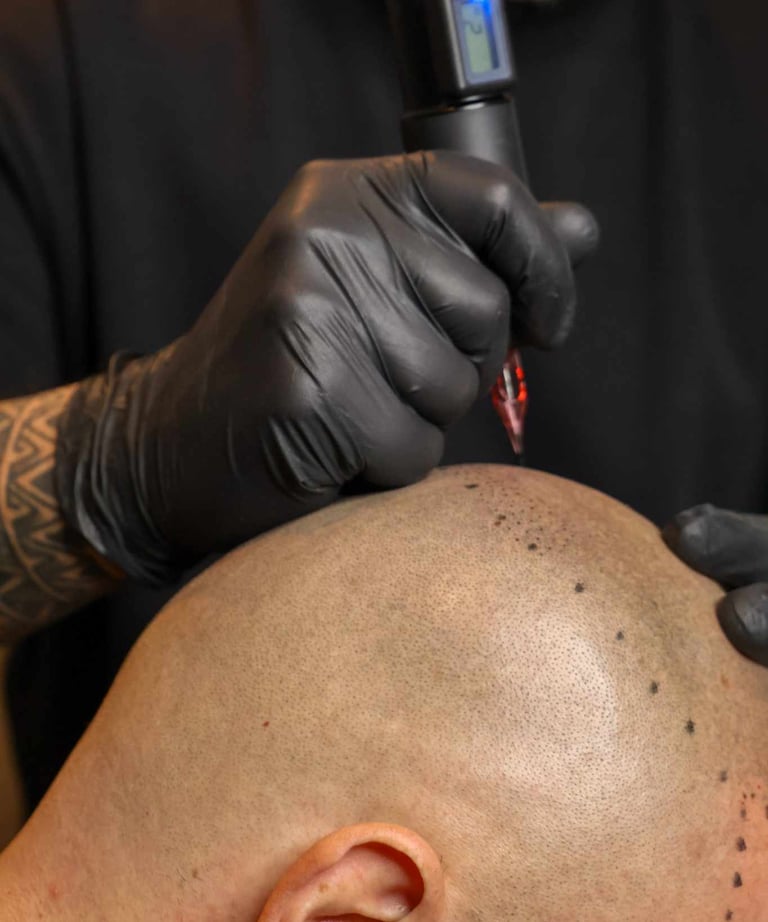 La micropigmentation est une technique de tatouage aux pigments naturels qui permet de dissimuler une chute de cheveux, qu'elle soit liée à une calvitie, une pelade, une alopécie, ou même une cicatrice au niveau du cuir chevelu.